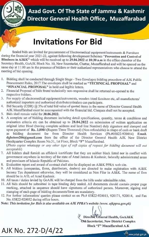 AJK Advertisements 14 اپریل 2022 ڈائریکٹر جنرل ہیلتھ آفس، مظفرآباد، الیکٹرومیڈیکل ایکیوپمنٹ/ انسٹرومنٹس اور فرنیچر کی خریداری کے لیے سربمہر پیشکشیں مطلوب ہیں