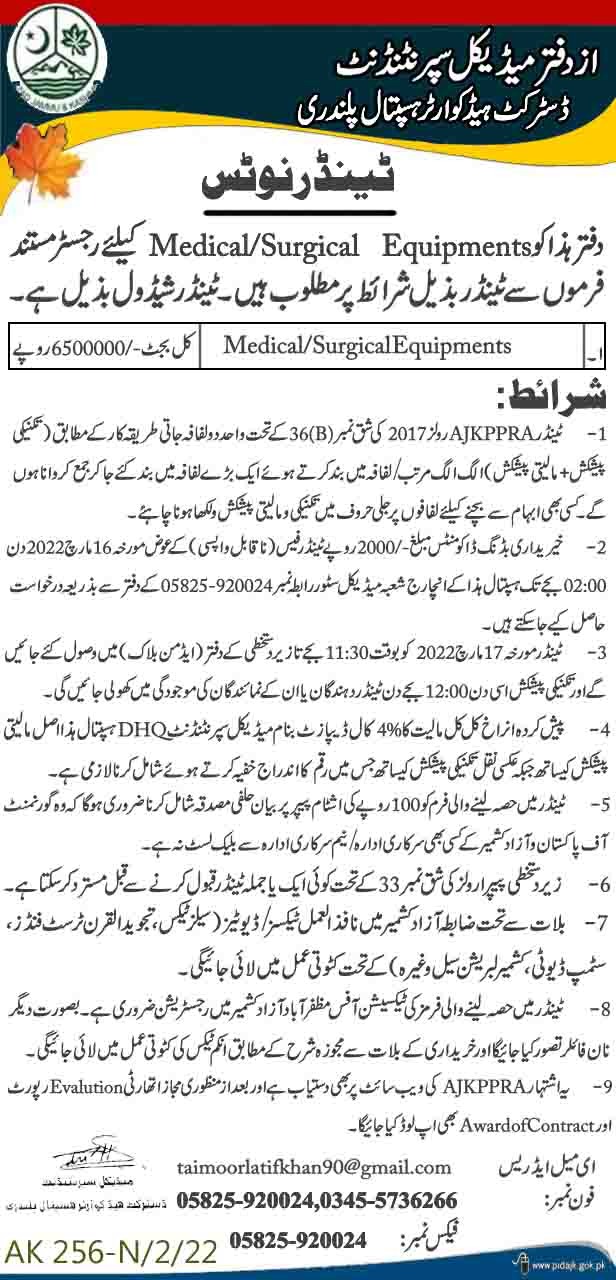 AJK Advertisements 19 فروری 2022 آزاد کشمیر، ڈسٹرکٹ ہیڈکوارٹر ہسپتال پلندری کیلئے رجسٹرڈ مستند فرموں سے ٹینڈر برائے میڈیکل /سرجیکل آلات میڈیکل سپرنٹنڈنٹ کی جانب سے دی گئی شرائط پر مطلوب ہیں