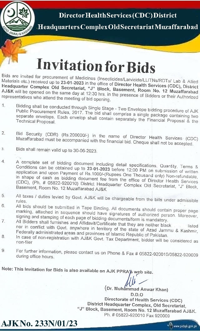 AJK Advertisements 06 جنوری 2023 ڈائریکٹر ہیلتھ سروسز (سی ڈی سی) ڈسٹرکٹ ہیڈ کوارٹرکمپلیکس اولڈ سیکرٹریٹ مظفر آباد کو ادویات کے خریداری کے لیے ٹینڈر مطلوب ہیں