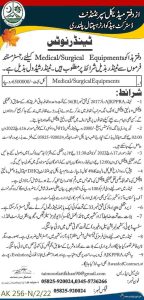 آزاد کشمیر، ڈسٹرکٹ ہیڈکوارٹر ہسپتال پلندری کیلئے رجسٹرڈ مستند فرموں سے ٹینڈر برائے میڈیکل /سرجیکل آلات میڈیکل سپرنٹنڈنٹ کی جانب سے دی گئی شرائط پر مطلوب ہیں