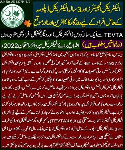 الیکٹریکل انجینئرز اور 3 سالہ الیکٹریکل ڈپلومہ کے حامل افراد کے لیے روزگار کا بہترین اور نادر موقع TEVTA سے ایک سالہ کورس (الیکٹریکل) اوردیگر ٹیکنیکل افراد بھی متوجہ ہوں (درخواستیں مطلوب ہیں) اطلاع برائے الیکٹریکل سپروائزر امتحان 2022