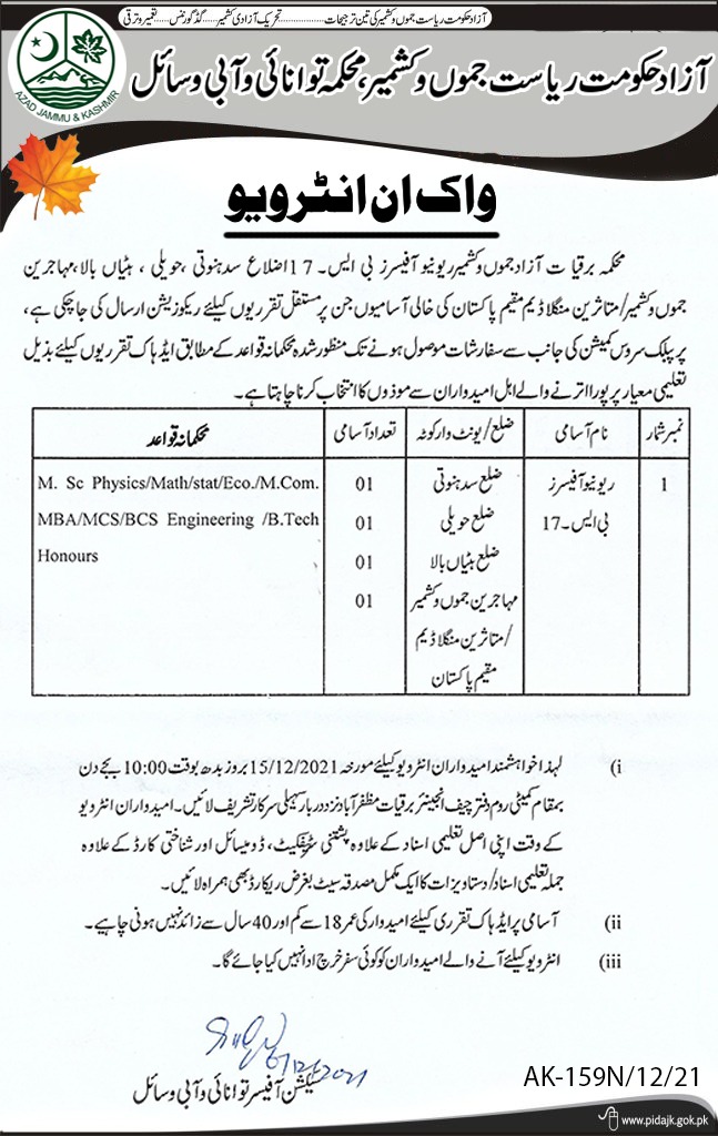 محکمہ برقیات آزاد جموں و کشمیر ریونیو آفیسرز پی ایس -17اضلاع سدہنوتی ، حویلی، ہٹیاں بالا، مہاجرین جمو ں و کشمیر/متاثرین منگلا ڈیم مقیم پاکستان کی خالی آسامیوں جن پرمستقل تقرریو ں کیلئے ریکوزیشن ارسال کی جاچکی ہے، پر پبلک سروس کمیشن کی جانب سے سفارشات موصول ہونے تک منظور شدہ محکمانہ قواعد کے مطابق ایڈہاک تقرریوں کیلئے بذیل تعلیمی معیار پر پورا اترنے والے اہل امیدواران سے موذوں کا انتخاب کرنا چاہتا ہے۔