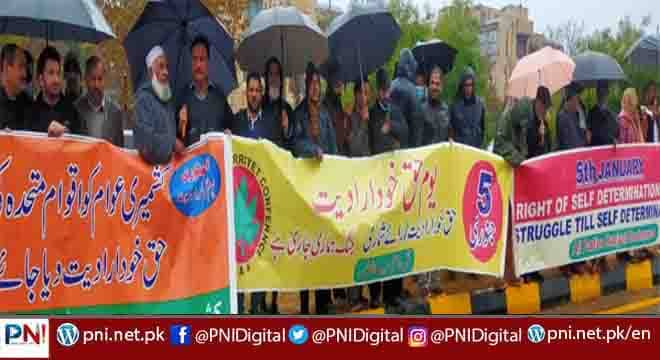 اسلام آباد (پی آئی ڈی) کل جماعتی حریت کانفرنس اور جموں و کشمیر لبریشن سیل میڈیا ونگ کشمیر سنٹر راولپنڈی کے زیر اہتمام حق خودارادیت کے موقع پر اقوام متحدہ کے مبصر مشن کے سامنے ایک احتجاجی مظاہرہ کیا گیا جس میں شدید بارش کے باوجود عوام کی کثیر تعداد نے شرکت کی۔ مظاہرے سے کل جماعتی حریت کانفرنس کے کنوینر فاروق رحمانی، غلام محمد صفی ، میڈم شمیم شال، ڈائریکٹر لبریشن سیل سرور حسین گلگتی، شیخ عبد المتین، ایڈووکیٹ پرویز احمد، عبد الحمید لون ،عبدالمجید میر اور داود احمد یوسفزئی نے خطاب کیا ۔