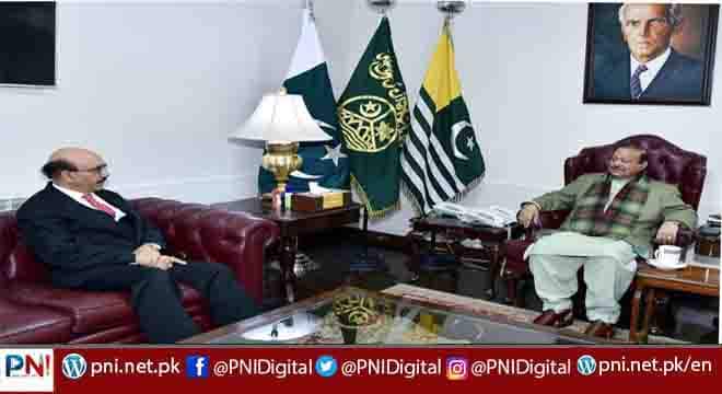 اسلام آباد (پی آئی ڈی آزاد کشمیر) صدر آزاد جموں وکشمیر بیرسٹر سلطان محمود چوہدری سے سابق صدر آزاد جموں وکشمیر و امریکہ کے لئے نامزد سفیر سردار مسعود خان کی ایوان صدر کشمیر ہاؤس اسلام آبادمیں تفصیلی ملاقات۔