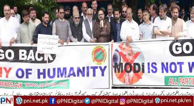 اسلام آباد (پی آئی ڈی) وزیر اعظم آزاد حکومت ریاست جموں و کشمیر سردار تنویر الیاس خان کی اپیل پر بھارتی وزیراعظم نریندر مودی کے دورہ مقبوضہ جموں و کشمیر کے خلاف آزادکشمیر بھر اور پاکستان کے بڑے شہروں میں احتجاجی مظاہرے کئے گئے۔ کل جماعتی حریت کانفرنس کی آزادکشمیر شاخ کے زیر اہتمام اسلام آباد میں بھارتی سفارتخانے کے سامنے احتجاجی مظاہرہ کیاگیا۔ احتجاجی مظاہرین نے آزادی اورپاکستان کے حق میں نعرے لگائے۔