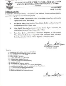 ایس پی کوٹلی شوکت حیات کو تبدیل کرکےایس پی باغ تعینات کیا گیا ہے ایس پی باغ،مرزا زاہد حسین ایس پی جہلم ویلی جبکہ راجہ عبدالقدوس کو ایس پی سدھنوتی تعینات کیا گیا ہے ۔۔