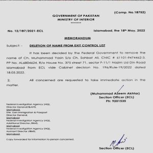 سابق دور حکومت میں چوہدری یاسین کا نام ای سی ایل میں شامل کیا گیاتھا۔۔۔۔