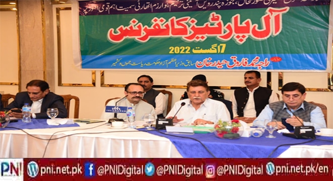 آزاد کشمیر کے سابق وزیراعظم آزاد حکومت ریاست راجہ محمد فاروق حیدر کی میزبانی میں اتوار کے روز اسلام آباد کے مقامی ہوٹل میں منعقدہ کل جماعتی کانفرنس میں آزاد کشمیر اور مقبوضہ کشمیر کی نمائندہ سیاسی قیادت اور 19 جماعتوں کے زعماء نے شرکت کی۔ کانفرنس میں شرکت کرنے والوں میں وزیراعظم ٓزاد کشمیرسردار تنویر الیاس خان، چوہدری محمد یاسین صدر پاکستان پیپلز پارٹی آزاد کشمیر،شاہ غلام قادرصدر پاکستان مسلم لیگ ن آزاد کشمیر، مرزا محمد شفیق جرال صد مسلم کانفرنس،سردار حسن ابراہیم،صدر جموں وکشمیر پیپلز پارٹی،قائد حزب اختلاف چوہدری لطیف اکبر، سابق صدر راجہ محمد ذوالقرنین خان،سابق صدر حاجی سردار محمد یعقوب خان،سابق وزیراعظم سردار عبدالقیوم نیازی،سیکرٹری جنرل مسلم لیگ ن آزاد کشمیرچوہدری طارق فاروق،امیر جمعیت العلما ئے اسلام آزاد کشمیرمولانا سعید یوسف،امیر جماعت اسلامی آزاد کشمیرڈاکٹر خالد محمود،امیر جمعیت العلمائے پاکستان آزاد کشمیرمولانا امتیاز صدیقی،کنونیئر حریت کانفرنس محمود احمد ساغر،وائس چیئرمین بار کونسل سردار طارق مسعود ایڈووکیٹ،صدر سپریم کورٹ بار آزا دکشمیر راجہ طارق بشیر ایڈووکیٹ،صدر ہائی کورٹ بار آزاد کشمیرہارون ریاض مغل ایڈووکیٹ،ممبراان سمبلی کرنل وقار احمد نور، سردار عامر الطاف،حافظ احمد رضاقادری، محترمہ نثارہ عباسی،حریت رہنمامحمد فاروق رحمانی، صدر جموں کشمیر لبریشن لیگ خواجہ منظو رقادر ڈار، شامل تھے۔