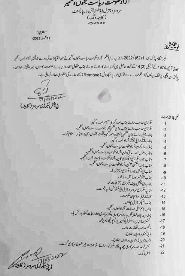مظفرآباد سے پریس انفارمیشن ڈیپارٹمنٹ کی پریس ریلیز کے مطابق وزیر اعظم آذاد کشمیر سردار تنویر الیاس خان نے وزیر حکومت چوہدری مقبول گجر کو وزارت کی ذمہ داریوں سے سبکدوش کر دیا۔ چوہدری مقبول گجر کو کوڈ آف کنڈکٹ، پارٹی پالیسی اور رولز آف بزنس کی مسلسل خلاف ورزی کرنے پر کابینہ سے برطرف کیا گیا، چوہدری مقبول گجر کو پارٹی قیادت اور حکومت کی طرف سے بار ہا وارننگ د ی گئی لیکن اس کے باوجود وہ خلاف ضابطہ کاروائیوں سے باز نہ آئے جس پر آج انہیں کابینہ سے فارغ کر دیا گیا۔اس حوالہ سے محکمہ سروسز اینڈ جنرل ایڈمنسٹریشن سے نوٹیفکیشن جاری کر دیا گیا ہے۔۔۔۔