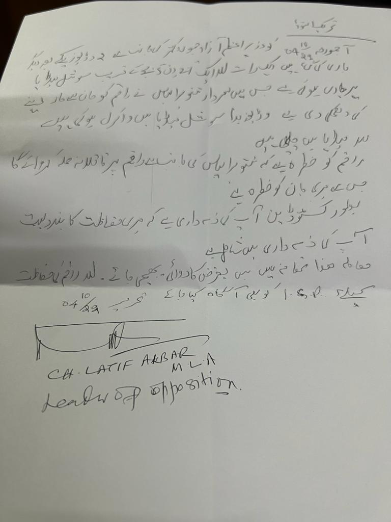 درخواست قائد حزب اختلاف چوہدری لطیف اکبر سابق وزیراعظم آزادکشمیر راجہ محمد فاروق حیدر خان نے اپوزیشن اراکین اسمبلی کے ہمراہ ایس ایچ او تھانہ سول سیکرٹریٹ کو جمع کروائی جس میں موقف اختیار کیا گیا ہے کہ راقم قانون ساز اسمبلی آزاد جموں و کشمیر کا رکن ہے۔ کل مورخہ 03 اکتوبر 2022 بوقت 12:50 کو اسمبلی کے اجلاس میں شریک تھا کہ اپوزیشن لیڈر چوہدری لطیف اکبر صاحب نے وزیراعظم آزاد کشمیر کے خلاف تحریک استحقاق پیش کی جس پر بحث کے دوران وزیر قانون فہیم ربانی نے خلاف قانون قائد ایوان کی کرسی پر کھڑے ہو کر بدوں اجازت سپیکر بولنا شروع کر دیا جس کی نشاندھی کی گئی لیکن وزیر موصوف جناب قائد ایوان کی نشست پر کھڑے رہے۔ سپیکر صاحب کو وزیر موصوف کو اپنی نشست پر بیٹھنے کی ہدایت کی جس پر وزیر موصوف برا مان گئے اور ڈیسک پر موجود موبائل فون اٹھا کر راقم کو زور سے دے مارا جو کہ راقم کے بائیں جانب سینے پر لگا جس سے مجھے شدید تکلیف پہنچی