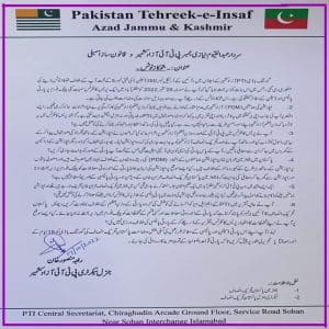 آپ اپنے پارٹی ڈسپلن اور پالیسی کے مغائر طرز عمل کی تسلی بخش وضاحت پاکستان تحریک انصاف کی گورننگ باڈی کو پندرہ ایام کے اندر اصالتا یا تحریری طور پر پیش کریں۔۔۔۔۔