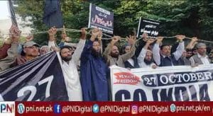 ہندوستان کی جانب سے 27 اکتوبر 1947 کو مقبوضہ کشمیر میں فوجیں اتارنے اور مقبوضہ کشمیر پر جابرانہ قبضے کے خلاف آزادکشمیر کے دارلحکومت مظفرآباد کشمیر لبریشن آرگنائزیشن کے زیر اہتمام سرکاری سطح پر بڑے احتجاجی جلسہ سے وزیراعظم آزادکشمیر سردار تنویر الیاس خان، مسلم لیگ ن کے صدر شاہ غلام قادر، سینئر موسٹ وزیر خواجہ فاروق احمد، ڈپٹی سپیکر چوہدری ریاض احمد، حریت رہنما سید یوسف نسیم، وزیر حکومت چوہدری اکبر ابراہیم، پروفیسر تقدیس گیلانی سمیت سیکرٹریز حکومت، سرداری افسران، سول سوسائٹی سمیت تمام مکاتب فکر کے افراد نے شرکت کی۔