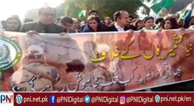 اسلام آباد (پی آئی ڈی ) یوم سیاہ کے موقع پر کشمیریوں سے اظہار یکجہتی کےموقع پر اسلام آباد میں ریلی نکالی گئی۔ ریلی وزارت خارجہ سے شروع ہوئی اور ڈی چوک پر اختتام پذیر ہوئی۔