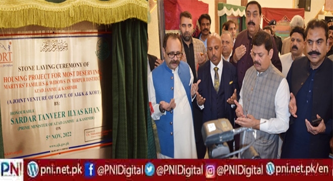 میرپور(آئی اے اعوان)وزیر اعظم آزادکشمیر سردار تنویر الیاس نے کشمیر آرفن ریلیف ٹرسٹ کے تعاون سے شہداء کے ورثاء،یتیم بچوں،بیوہ خواتین اور مستحق افراد کیلئے پانچ سوگھروں کی تعمیر کے بڑے منصوبے کا افتتاح کیا ۔وزیراعظم آزاد سردار تنویر الیاس نے اپنے دورہ میرپور کے دوران معروف رفاعی ادارے کورٹ KORT کے باہمی اشتراک سے شہداء کے لواحقین، بیواؤں اور مستحق خاندانوں کے لیے ہاوسنگ پراجیکٹ کا باضابطہ افتتاح کیا