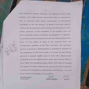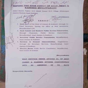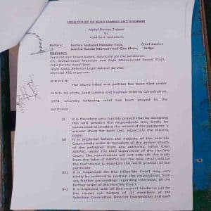 مظفرآباد (آئی اے اعوان) آزاد جموں وکشمیر ہائی کورٹ نے پبلک سروس کمیشن میں بڑے پیمانے پر بے ضابطگیوں اورمن مانیوں کا سختی سے نوٹس لیتے ہوئے گریڈ 4 سے گریڈ 20 تک کے تمام غیر جریدہ ملازمین اور آفیسران کو عہدوں سے ہٹانے کا حکم دیاہے ۔فاضل عدالت نے درخواست گزار عبدالبصیر تاجور کے پرچے آزاد جموں وکشمیر یونیورسٹی کے مستند پروفیسرز سے دوبارہ چیک کرانے کا حکم بھی دیا ۔