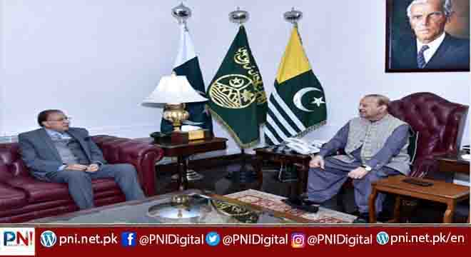 اسلام آباد (پی این آئی) صدر آزاد جموں وکشمیر بیرسٹر سلطان محمود چوہدری سے چیف جسٹس آزاد جموں وکشمیر سپریم کورٹ جسٹس راجہ سعید اکرم کی ایوان صدر کشمیر ہاؤس اسلام آباد میں ملاقات۔