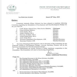 مظفرآباد (آئی اےا عوان) وزیراعظم آزادکشمیر چوہدری انوار الحق نے مالی سال 2023/24 کے ترقیاتی اور غیر ترقیاتی بجٹ کی تیاری کیلئے موسٹ سینئر وزیر کرنل ریٹائرڈ وقار نور کی سر براہی میں 9 رکنی اعلیٰ سطحی کمیٹی قائم کے قیام کی منظوری دی ہے۔۔۔ آزاد کشمیر کابینہ کے رکن راجہ فیصل ممتاز راٹھور،ممبران اسمبلی اظہر صادق،عبدالوحید،دیوان علی چغتائی،عبدالماجد خان،عامر الطاف،سیکرٹری پلاننگ اینڈ ڈویلپمنٹ اور سیکرٹری مالیات کمیٹی کے رکن مقرر کیئے گئے ہیں۔۔۔
