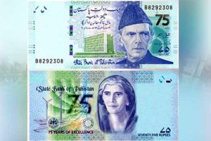تفصیلات کے مطابق گورنر اسٹیٹ بینک جمیل احمد نے کہا کہ آج تاریخی دن ہے اور اسی مناسبت سے 75 روپے کا نیا یادگاری نوٹ جاری کررہے ہیں، جو محض ایک مرتبہ جاری کی جاری ہوگا۔اسٹیٹ بینک کی جانب سے جاری کیے گئے نئے 75 روپے کے نوٹ کے فرنٹ پر قائداعظم اور عقب میں محترمہ فاطمہ جناح کی تصویر موجود ہیں جبکہ نوٹ پر متبادل توانائی کی اہمیت اجاگر کرنے کیلئے ونڈ مل اور سولر پینل بنائے گئے ہیں۔واضح رہے کہ نوٹ پر خطاطی سے بنی اسٹیٹ بینک کی عمارت بھی نوٹ پر موجود ہے۔