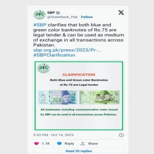 اس حوالے سے اسٹیٹ بینک آف پاکستان کا کہنا ہے کہ 75 روپے کا ہرا اور نیلا نیا نوٹ دونوں پاکستان میں لین دین کیلئے استعمال کیے جاسکتے ہیں۔۔۔۔