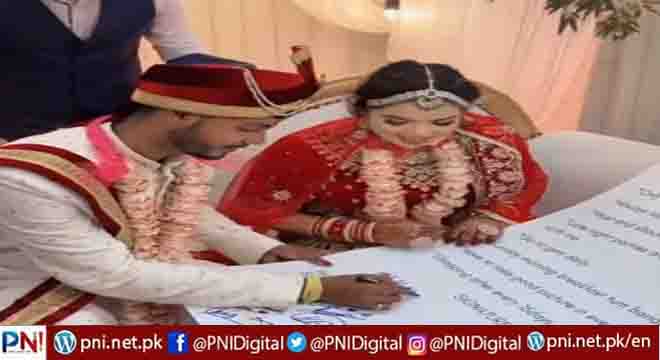 شادی بیاہ میں منفرد رسومات اب ایک عام بات ہے۔ کہیں دلہن کی خواہش ہر دولہا کشتی میں بیٹھ کر آتا ہے تو کہیں ہاتھی کی سواری کرتے ہوئے انٹری ہوتی ہے تو کہیں شیشہ پلائی کی رسم کا انعقاد ہوتا ہے،ایسے میں بھارت کی ایک شادی کی ویڈیو وائرل ہو رہی ہے جہاں شادی کی رسموں سے قبل دلہن نے ایک انوکھا معاہدہ دولہا سے پورے شادی ہال کے سامنے دستخط کروایا۔دلہن نے ایک بڑا سا کارڈ نما معاہدہ سب کے سامنے دولہا کو دکھایا جس پر کئ شرطیں درج تھیں: