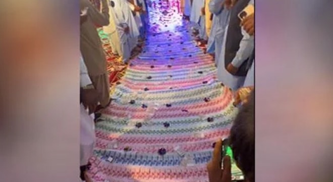 بنے ہار کو لوگ اٹھائے آرہے ہیںجس میں 100، 500 اور ہزار کے نوٹوں کا استعمال کیا گیا ہے۔نوٹوں کے اس ہار کی لمبائی دیکھ کر ہر دیکھنے والا حیرت میں مبتلا ہوگیا، ویڈیو میں دیکھا جاسکتا ہے کہ شادی میں شریک افراد بھی اس منظر کو اپنے کیمرے کی آنکھ میں محفوظ کر رہے ہیں۔سوشل میڈیا پر وائرل ویڈیو سے متعلق یہ بھی کہا جا رہا ہے کہ دلہے کے ہار کی مالیت 16 لاکھ روپے ہے، ویڈیو پر سوشل میڈیا صارفین کی جانب سے مختلف تبصروں کا سلسلہ بھی جاری ہے۔