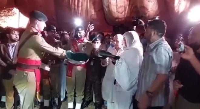 ویڈیو میں ایٹمی سائنسدان کی بڑی صاحبزادی کو پاک فوج کے جوان سے پرچم وصول کرتے اور بعد ازاں پرچم کو چومتے دیکھا جاسکتا ہے۔خیال رہے کہ گزشتہ روز علی الصبح محسن پاکستان اور نامور ایٹمی سائنسدان ڈاکٹر عبدالقدیر خان 85 برس کی عمر میں انتقال کرگئے تھے۔ڈاکٹر عبدالقدیر خان کو سرکاری اعزاز کے ساتھ اسلام آباد کے ایچ 8 قبرستان میں سپردخاک کیا گیا۔