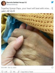 شرمیلا فاروقی نے والد محمد عثمان فاروقی کے انتقال کے بعد ایک جذباتی ٹوئٹ شیئر کیا ہے۔انہوں نے اپنے ٹوئٹ میں والد کے انتقال کی اطلاع دیتے ہوئے والد کا ہاتھ تھامے ایک تصویر شیئر کی۔اپنے ٹوئٹ میں انہوں نے لکھا کہ پاپا میرا اور آپ کا دل ہمیشہ ایک ساتھ دھڑکتا رہے گا۔شرمیلا فاروقی کے ٹوئٹ پر اہم شخصیات کی جانب سے تعزیتی پیغامات کا سلسلہ جاری ہے۔۔۔۔۔