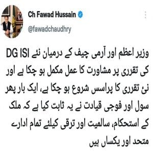 اسلام آباد (پی این آئی) وفاقی وزیر اطلاعات چوہدری فواد حسین نے کہا ہے کہوزیر اعظم اور آرمی چیف کے درمیان نئے DG ISI کی تقرری پر مشاورت کا عمل مکمل ہو چکا ہے۔ ٹویٹر پر اپنے ایک پیغام میںچوہدری فواد حسین نے کہا کہ نئی تقرری کا پراسس شروع ہو چکا ہے۔ وفاقی وزیر اطلاعات چوہدری فواد حسین کا کہنا تھا کہ ایک بار پھر سول اور فوجی قیادت نے یہ ثابت کیا ہے کہ ملک کے استحکام، سالمیت اور ترقی کیلئے تمام ادارے متحد اور یکساں ہیں۔ ۔۔۔۔