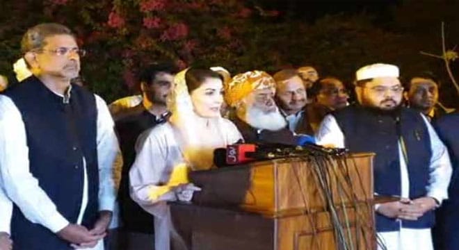 مریم نوز نے اپنے خطاب میں کہا کہ عمراقن نیا زی کو اب سیا سی شہید نہیں بننے دیا جا ئے گا اب وقت آ گیا ہے ووٹ کو عزت دینا پڑے گی یہ چارج شیٹ عمران خان کے خلاف نہیں اقیک اور حاضر سروس ملازم کے خلا ف ہے جس نے اپنے ادارے کو داغدار کیا فوج میں تقرریاں جن بھوت کر رہے ہیں حکومت نہیں عمران نیازی اپنا اقتدار بچا نے کے لیے فوج میں تقرریوں کا ڈرامہ کر رہا ہے آئی ایس آئی کے سربراہ کا تقرر وزیراعظم ہی کر تا ہے مگر وہ وزیر جس کو عوان نے چنا ہو نواز شریف نے اپنا معا ملا اللہ پر چھوڑا ہوا ہے نواقز شریف اور شہباز شریف جیسا ایماندار شخص پاکستان کو پہلے نہیں ملا