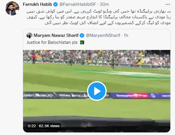 یہی وجہ رہی یا کچھ اور البتہ مریم نواز کی جانب سے کرکٹ میچ کے دوران کے مناظر کی ویڈیو شیئر کرنے کے بعد انہیں جواب دینے والوں کی اکثریت کا کہنا تھا کہ اس موقع پر ایک پرانی ویڈیو کیوں ٹویٹ کی گئی ہے؟مختصر سے وقت میں 60 ہزار سے زائد ویوز حاصل کر لینے والی ویڈیو پاکستانی ٹیم کے ایک سابقہ میچ کے دوران بنائی گئی تھی، اس میچ کے دوران کیمرہ آسمان پر اڑنے والے جہاز کو فوکس میں لاتا ہے تو اس کے عقب میں لہراتا بینر واضح دکھایا جاتا ہے جس پر ’جسٹس فار بلوچستان‘ تحریر ہے۔مریم نواز کی جانب سے ٹویٹ کی گئی مختصر دورانیے کی یہ ویڈیو شیئر کیے جانے کے فورا بعد سوالات، تنقید اور طنز کا نشانہ بنی تو اس پر تبصرہ کرنے والوں کی بڑی تعداد اس بات پر بھی حیران تھی کہ پرانی ویڈیو کو ٹی 20 ورلڈ کپ کے دوران کیوں شیئر کیا گیا ہے۔ویڈیو پر تبصرہ کرنے والوں میں سے کچھ نے ’پاکستان کے میچ کے دوران انڈین لابی کی جانب سے لہرایا گیا بینر‘ ٹویٹ کرنے کو مریم نواز کا نامناسب اقدام کہا تو کچھ ان کی ٹویٹ میں درج ’جسٹس فار بلوچستان‘ کے پیغام کی حمایت کرتے رہے۔