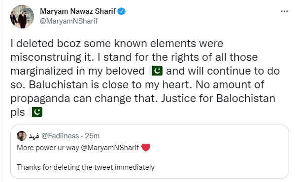 ن لیگ کی نائب صدر کی جانب سے کچھ دیر میں ایک اور ٹویٹ کے ذریعے معاملے کی وضاحت کی گئی تو لکھا کہ کچھ معلوم لوگ اسے غلط رنگ دے رہے تھے۔انہوں نے مزید لکھا کہ ’میں پاکستان میں نظرانداز ہونے والے سبھی کے ساتھ ہوں اور یہ سلسلہ جاری رکھوں گی۔ بلوچستان میرے دل کے قریب ہے، پروپیگنڈا کتنا بھی کیوں نہ ہو اسے تبدیل نہیں کر سکتا۔‘اس مرحلے پر انہوں نے ’جسٹس فار بلوچستان‘ کا سلوگن ایک مرتبہ پھر اپنی ٹویٹ کا حصہ بھی بنایا۔