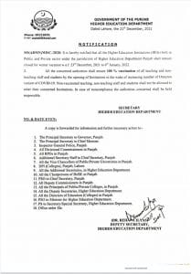 ہائر ایجوکیشن ڈیپارٹمنٹ نے اس ضمن میں ٹیچنگ اور نان ٹیچنگ اسٹاف کو سو فیصد ویکسینیشن کو یقینی بنانے کی ہدایت بھی کی ہے۔ یاد رہے کہ گزشتہ روز پنجاب بھر کے کالجز اور یونیورسٹیز میں موسم سرما کی چھٹیوں کے حوالے سے گردش کرنے والا نوٹیفیکیشن جعلی نکلا تھا جس کی پنجاب ہائر ایجوکیشن ڈیپارٹمنٹ نے اپنے ٹوئیٹر اکاؤنٹ سے تردید بھی کی تھی۔