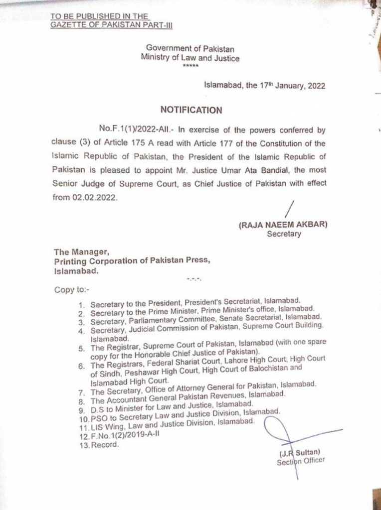 اسلام آباد(پی این آئی) وزارت قانون کی جانب سے نئے چیف جسٹس آف پاکستان کی تعیناتی کے حوالے سے نوٹیفکیشن جاری کردیا گیاہے۔سپریم کورٹ کے جسٹس عمر عطا بندیال سپریم کورٹ کے نئے چیف جسٹس ہونگے وہ 2 فروری سے اپنے عہدے کا حلف اٹھائیں گے۔موجود ہ چیف جسٹس آف پاکستان جسٹس گلزار احمد یکم فروری کو اپنے عہدے سے ریٹائرڈ ہونگے۔