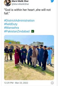 لیڈی اسسٹنٹ کمشنر نے اپنی ٹوئٹ میں پاکستان زندہ باد اور مانسہرہ کا ہیش ٹیگ بھی استعمال کیا۔ یہ بات اہم ہے کہ کچھ روز قبل اسسٹنٹ کمشنر مانسہرہ ماروی شیر ملک کی گاڑی کو 3 ملزمان کئی بار اوور ٹیک کیا تھا اس دوران ملزمان خاتون اسسٹنٹ کمشنر کی تصاویر اور ویڈیو بھی بناتے رہے اور پھر غازی کوٹ میں 3 افراد نے ان پر حملہ کر دیا تھا۔ مقامی ملزمان نے اسسٹنٹ کمشنر کی گاڑی کے سامنے اپنی گاڑی روک کر دھمکی دیتے ہوئے کہا تھا کہ یہ خاتون ہوکر ہم پر اے سی تعینات ہوئی، ہم کسی خاتون کو اے سی یا ڈی سی نہیں مانتے۔