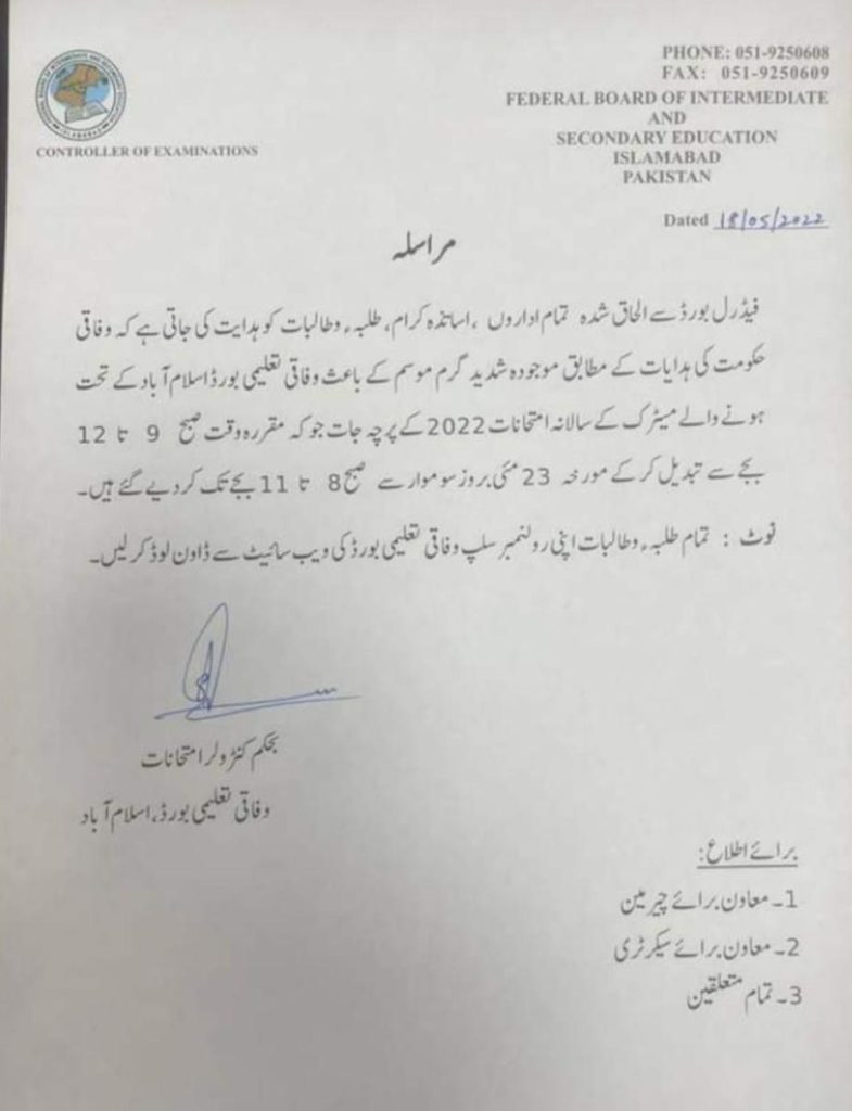 وفاقی تعلیمی بورڈ اسلام آباد کی جانب سے جاری کیے گئے مراسلے کےمطابق وفاقی تعلیمی بورڈ سے الحاق شدہ تمام تعلیمی اداروں کے سربراہان اساتذہ اور طلباء وطالبات میٹرک کے امتحان میں پرچوں کے اوقات کی تبدیلی سے آگاہ کیاگیا ہے جبکہ طلباءو طالبات کو اپنی رولنمبر سلپ وفاقی تعلیمی بورڈ کی ویپ سائٹ سے ڈاون لوڈ کرنے کی ہدایت کی گئی ہے۔۔۔