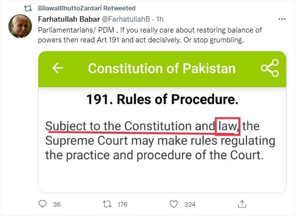 پی پی سینیٹر کی جانب سے کیے گئے ٹوئٹ میں کہا گیا کہ ارکان پارلیمنٹ اور پی ڈی ایم آئین کا آرٹیکل 191 پڑھیں، طاقت کا توازن ٹھیک کرنے کیلئے فیصلہ کرنے کا وقت آ گیا۔ بعد ازاں بلاول بھٹو نے بھی فرحت اللہ بابر کا ٹوئٹ ری ٹوئٹ کر دیا۔ دوسری جانب سپریم کورٹ آف پاکستان میں ڈپٹی اسپیکر رولنگ کیس کا فیصلہ ساڑھے 7 بجے سنایا جائے گا۔