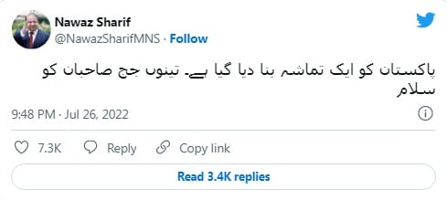اسلام آباد: (الجریدہ نیوز) وزیر اعلیٰ پنجاب کے انتخاب میں ڈپٹی سپیکر کی رولنگ کے خلاف درخواست پر سپریم کورٹ کے فیصلے پر سابق وزیر اعظم نواز شریف کا رد عمل بھی آگیا۔ اپنے ایک ٹویٹ میں نواز شریف نے عدالتی فیصلے پر کہا “پاکستان کو ایک تماشہ بنا دیا گیا ہے۔ تینوں جج صاحبان کو سلام۔”خیال رہے کہ سپریم کورٹ نے ڈپٹی سپیکر پنجاب اسمبلی کی رولنگ کے خلاف پرویز الہیٰ کی درخواست منظور کرلی ہے۔