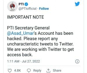 پی ٹی آئی کی جانب سے جاری کیے جانے والے پیغام میں اپیل کی گئی ہے کہ براہ کرم اس اکاؤنٹ سے کسی بھی غیر معمولی ٹوئٹ کے موصول ہونے پر اطلاع دیں۔ یہ بھی بتایا گیا ہے کہ اسد عمر کے ٹوئٹر اکاؤنٹ کو بحال کرنے کی کوششیں کی جا رہی ہیں۔۔۔۔