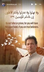 اسلام آباد (پی این آئی) چیئرمین پاکستان تحریکِ انصاف عمران خان کی جانب سے فارن فنڈنگ کیس کا فیصلہ آنے سے قبل سوشل میڈیا پر قرآن پاک کی ایک آیت شیئر کی گئی ہے۔آج کے وز 8سال قبل ممنوعہ فنڈنگ کیس میں محفوظ کیا گیا فیصلہ سنایا گیاہے۔اس موقع پر عمران خان نے اپنے سوشل میڈیا پر قرآنی آیت شیئر کی ہے جس میں اللّٰہ پر یقین اور اللّٰہ کی جانب سے آنے والی مدد سے متعلق پیغام دیا گیا ہے۔آیت کا مفہوم ہے کہ ’نہ جھکو اور نہ غم کرو، جیت تمہاری ہی ہوگی، اگر تم سچے مومن ہو‘۔ ( القرآن 3:139))
