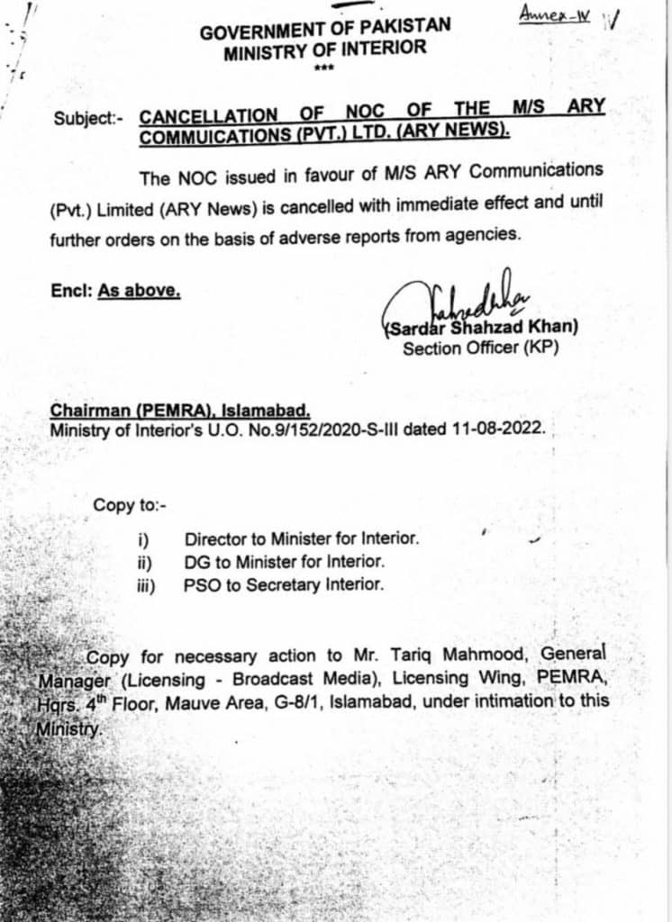 اسلام آباد : وفاقی وزارت داخلہ نے نجی ٹی وی اے آر وائی نیوز کا این او سی منسوخ کردیا۔ وزارت داخلہ کی جانب سے اے آر وائی نیوز کا این او سی منسوخ کرنے کے حوالے سے باضابطہ نوٹیفکیشن جاری کردیا گیا ہے۔ وزارت داخلہ کا کہنا ہے کہ این او سی ایجنسیوں کی رپورٹ کی بنا پر منسوخ کیا گیا ہے۔ اس حکم کا اطلاق فوری طور پر ہوگا اور تاحکم ثانی این او سی منسوخ رہے گا۔