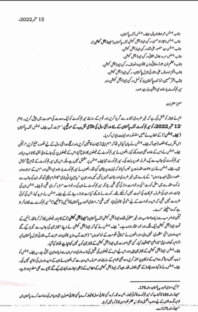 سپریم کورٹ کے دونوں ججز نے اپنے خط میں لکھا کہ انہوں نے ہمیشہ سپریم کورٹ کو ایک وحدت کی صورت پیش کرنے کی کوشش کی لیکن 12 ستمبر کو نئے عدالتی سال کے موقع پر چیف جسٹس آف پاکستان کے خطاب نے ششدر اور انتہائی مایوس کیا۔ چیف جسٹس نے یکطرفہ طور پر سپریم کورٹ کی طرف سے بات کی جب کہ سپریم کورٹ تنہا چیف جسٹس پر مشتمل نہیں ہے بلکہ اس میں سپریم کورٹ کے تمام جج شامل ہیں۔خط میں مزید کہا گیا ہے کہ اپنے خطاب کے دوران چیف جسٹس نے زیر سماعت مقدمات پر بات کی، سپریم کورٹ بار ایسوسی ایشن کے موجودہ اور سابق عہدیداروں کے بارے میں غیر ضروری اور اہانت آمیز باتیں کیں، انہوں نے جیوڈیشل کمیشن آف پاکستان کے کام اور فیصلوں کا بھی ذکر کیا جو سب سے زیادہ نا مناسب اور غیر معقول تھا، چیف جسٹس نے ججز کی تقرری کے حوالے سے جیوڈیشل کمیشن کا فیصلہ نہ مان کر اس کی تحقیر کی ہے۔