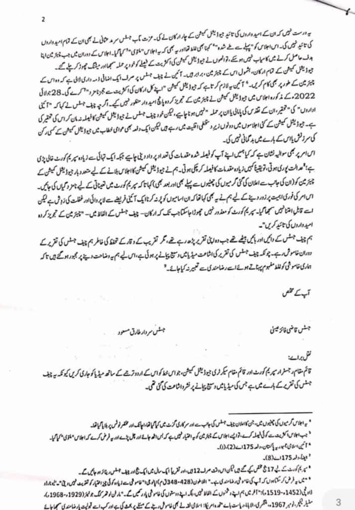 جسٹس قاضی فائز عیسیٰ اور جسٹس سردار طارق مسعود کے مطابق تقریر کے دوران وہ دونوں چیف جسٹس کے دائیں اور بائیں بیٹھے تھے مگر تقریب کے وقار کے تحفظ کی خاطر وہ چیف جسٹس کی تقریر کے دوران خاموش رہے، چونکہ ان کی تقریر کی اشاعت میڈیا میں وسیع پیمانے پر ہوئی ہے اس لیے ہم یہ وضاحت دینے پر مجبور ہوگئے ہیں ۔انہوں نے خط کی نقل قائم مقام رجسٹرار سپریم کورٹ اور قائم مقام سیکریٹری جیوڈیشل کمیشن کو ارسال کرتے ہوئے ہدایت کی کہ اس خط کو اردو ترجمے کے ساتھ میڈیا کو جاری کیا جائے۔