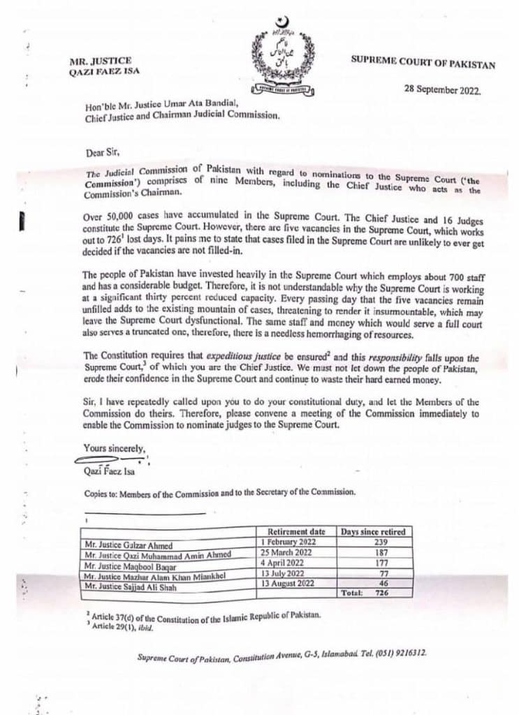 اس وقت سپریم کورٹ میں 50 ہزار کیسز زیر التوا ہیں لیکن اس کے باوجود عدالتِ عظمیٰ کی پانچ نشستیں خالی ہیں جو مجموعی طور پر 726 دنوں سے پر نہیں کی جاسکیں۔جسٹس قاضی امین 187 ،جسٹس گلزار کی ریٹائرمنٹ کو 239 روز گز گئے،جسٹس مقبول باقر کو سبکدوش ہوئے 177 ، جسٹس مظہر عالم 77 ،جسٹس سجاد علی کی ریٹائرمنٹ کو 46 دن گزر گئے ہیں۔خط میں کہا گیا ہے کہ آئین انصاف کی فوری فراہمی پر زور دیتا ہے، آئین کی پاسداری سپریم کورٹ کی ذمہ داری ہے،عوام سپریم کورٹ پر بھاری رقم خرچ کرتے ہیں، سمجھ سے بالاتر ہے کہ سپریم کورٹ 30 فیصد کم کیپسٹی پر کیوں چل رہی ہے، خدشہ ہے کہیں سپریم کورٹ غیر فعال ہی نہ ہو جائے۔انہوں نے چیف جسٹس سے مطالبہ کیا کہ وہ فوری طور پر جوڈیشل کمیشن کا اجلاس طلب کریں تاکہ خالی اسامیوں کو پر کیا جاسکے۔