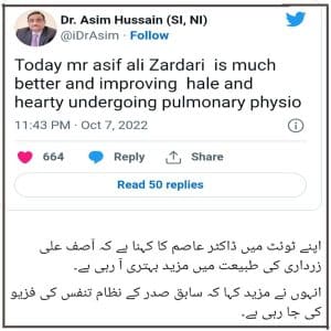 کراچی (پی این آئی) سابق صدر آصف زرداری کے قریبی دوست اور ان کے معالج ڈاکٹر عاصم حسین کا کہنا ہے کہ سابق صدر آصف علی زرداری کی طبیعت میں مزید بہتری آ رہی ہے۔ ٹوئٹر پر سابق صدر آصف علی زرداری کے معالج ڈاکٹر عاصم حسین نے آصف زرداری کی صحت سے متعلق معلومات جاری کی جس میں ڈاکٹر عاصم کا کہنا ہے کہ آصف علی زرداری کی طبیعت میں مزید بہتری آ رہی ہے۔