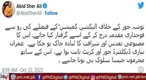 فیصل آباد (پی این آئی) ن لیگی عابد شیر علی نے عمران خان کی نااہلی سے متعلق الیکشن کمیشن کے فیصلے پر ردعمل دیتے ہوئے پی ٹی آئی چیئرمین عمران خان کی گرفتاری کا مطالبہ کر دیاہے ٹوئٹر پر جاری کیے گئے اپنے بیان میں عابد شیر علی نے کہا کہ توشہ چور کے خلاف الیکشن کمیشن کے فیصلے کی رو سے فوجداری مقدمہ درج کر کے عمران خان کو گرفتار کیا جائے۔انہوں نے کہا کہ اس کا مصنوعی تقدس اور شرافت کا لبادہ چاک ہو چکا ہے۔