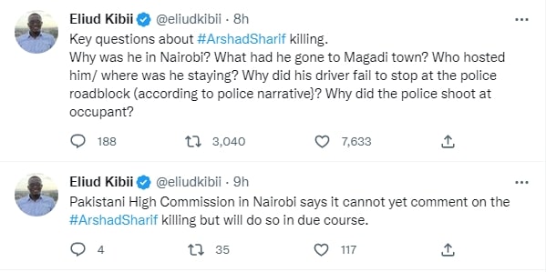 لاہور (پی این آئی) ارشد شریف کا مبینہ قتل، کینیا کے صحافی نے پولیس کے بیانات پر سوالات اٹھا دیے۔ تفصیلات کے مطابق سینئر صحافی ارشد شریف کے مبینہ قتل کے حوالے سے کینیا کی پولیس کی جانب سے دیے گئے بیانات پر کینیا کے اخبار دی سٹار سے وابستہ صحافی علییود کیبی کی جانب سے سوالات اٹھائے گئے ہیں۔
