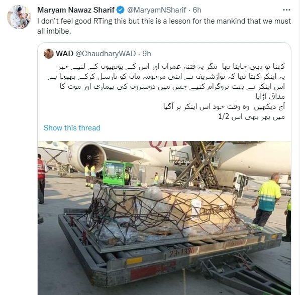 ایک ٹوئٹر اکاؤنٹ سے ارشد شریف کی جسد خاکی کی تصویر شئیر کی گئی اور کہا گیا کہ “کہنا تو نہیں چاہتا تھا مگر یہ فتنہ عمران اور اس کے یوتھیوں کے لیے خبر ،یہ اینکر کہتا تھا کہ نوازشریف نے اپنی مرحومہ ماں کو پارسل کرکے بھیجا ہے اس اینکر نے بہت پروگرام کیے جس میں دوسروں کی بیماری اور موت کا مذاق اڑایا آج دیکھیں وہ وقت خود اس اینکر پر آگیا”۔اس کا کہنا تھا کہ “اینکر کے مغفرت کی دعا کروں گا اور یہ مجھ سمیت سب کے لیے سبق ہے کہ کبھی بھی کسی کی لاش پر سیاست نہ کرو وقت گھوم کر کسی پر بھی آسکتا ہے”۔ مریم نواز نے اس ٹوئٹ کو ری ٹوئٹ کیا اور پھر تھوڑی دیر بعد اس حوالے سے وضاحت دیتے ہوئے کہا کہ مجھے اس ٹوئٹ کو ری ٹوئٹ کرتے اچھا نہیں لگ رہا لیکن یہ ایک سبق ہے جسے ہم سب کو اپنانا چاہیے۔
