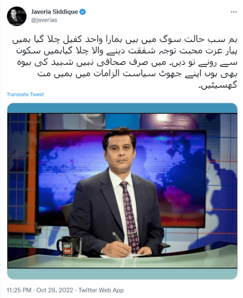 سماجی رابطے کی ویب سائٹ ٹوئٹرپر اپنے ٹوئٹ میں بیوہ جویریہ صدیق نے کہاکہ میں صرف صحافی نہیں شہید کی بیوہ بھی ہوں ،اپنے جھوٹ سیاست الزامات میں ہمیں مت گھسیٹیں۔بیوہ ارشد شریف کا ایک اور ٹوئٹ میں کہناتھا کہ میں تین قرآن کلاسز کا حصہ ہوں میرے اساتذہ نے کہا کہ تم کام بھی کرسکتی ہو انٹرویو بھی دے سکتی ہو کیونکہ ہمارا کفیل چلا گیا ہے۔ تم جیسے لوگوں سے مجھے اسلام پڑھنے کی ضرورت نہیں ہے۔جویریہ صدیق نے اپنے ٹوئٹ میں کہا کہ میرا کوئی بھائی نہیں دیور نہیں جیٹھ نہیں ،اپنے شوہر ارشد شریف شہید کیلئئے انصاف کی آواز بھی نا اٹھاؤ کہ میں عدت میں ہوں۔ان کاکہناتھا کہ مجھے تو کام بھی کرنا ہوگا کیونکہ تنقید کرنے والے میرا گھر نہیں چلائیں گے نا ہی مجھے انصاف ملنے کی کوئی امید ہے، ہر کوئی ہمارے محسنوں پر الزام لگا رہا ہے۔انہوں نے کہاکہ جب میری ارشد کی آخری کال پر بات ہوئی تو وہ لانگ مارچ کو لے کر بہت پرجوش تھا اور مجھے کہا جیا میں لانگ مارچ کے دن زیادہ وی لاگ کروں گا آج سب ہے میرا ارشد نہیں ہے بس۔