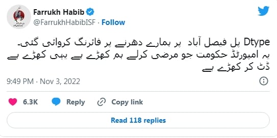 فیصل آباد (پی این آئی) پاکستان تحریک انصاف (پی ٹی آئی) کے چیئرمین عمران خان پر حملے کے خلاف فیصل آباد میں فرخ حبیب کی قیادت میں ہونے والے دھرنے پر فائرنگ کی گئی ہے۔پی ٹی آئی رہنما فرخ حبیب نے اپنے ایک ٹویٹ میں بتایا کہ ڈی ٹائپ پل فیصل آباد پر ہمارے دھرنے پر فائرنگ کروائی گئی۔یہ امپورٹڈ حکومت جو مرضی کرلے ہم کھڑے ہیں، یہیں کھڑے ہیں اور ڈٹ کر کھڑے ہیں۔