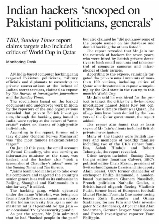 ڈان اخبار میں شائع رپورٹ کے مطابق بھارت میں مذکورہ اداروں کے صحافیوں کی جانب سے خفیہ تحقیقات اور اس کے نتیجے میں افشا ہونے والی دستاویزات سے یہ بات سامنے آئی ہے کہ نجی برطانوی تفتیش کار بھارت سے ہونے والی ہیکنگ گینگ کے ذریعے درجنوں اعلی شخصیات کی جاسوسی کر رہے تھے۔رپورٹ میں مزید بتایا گیا ہیکنگ گینگ نے پاکستان کے سینئر جنرلز کے علاوہ چین کے شہر بیجنگ ، شنگھائی اور نیپال کے دارالحکومت کھٹمنڈو کے سفارت خانوں کو بھی ہیکنگ کا نشانہ بنایا۔وائٹ انٹرنیشنل کے تحت کام کرنے والا ہیکنگ گینگ بھارت کی نواحی بستی گروگرم میں موجود عمارت کے چوتھے فلور سے کام کرتے ہے، ہیکنگ گینگ کا ماسٹر مائنڈ سائبر سیکیورٹی پنڈٹ 31 سالہ ادیتیا جین ہے۔